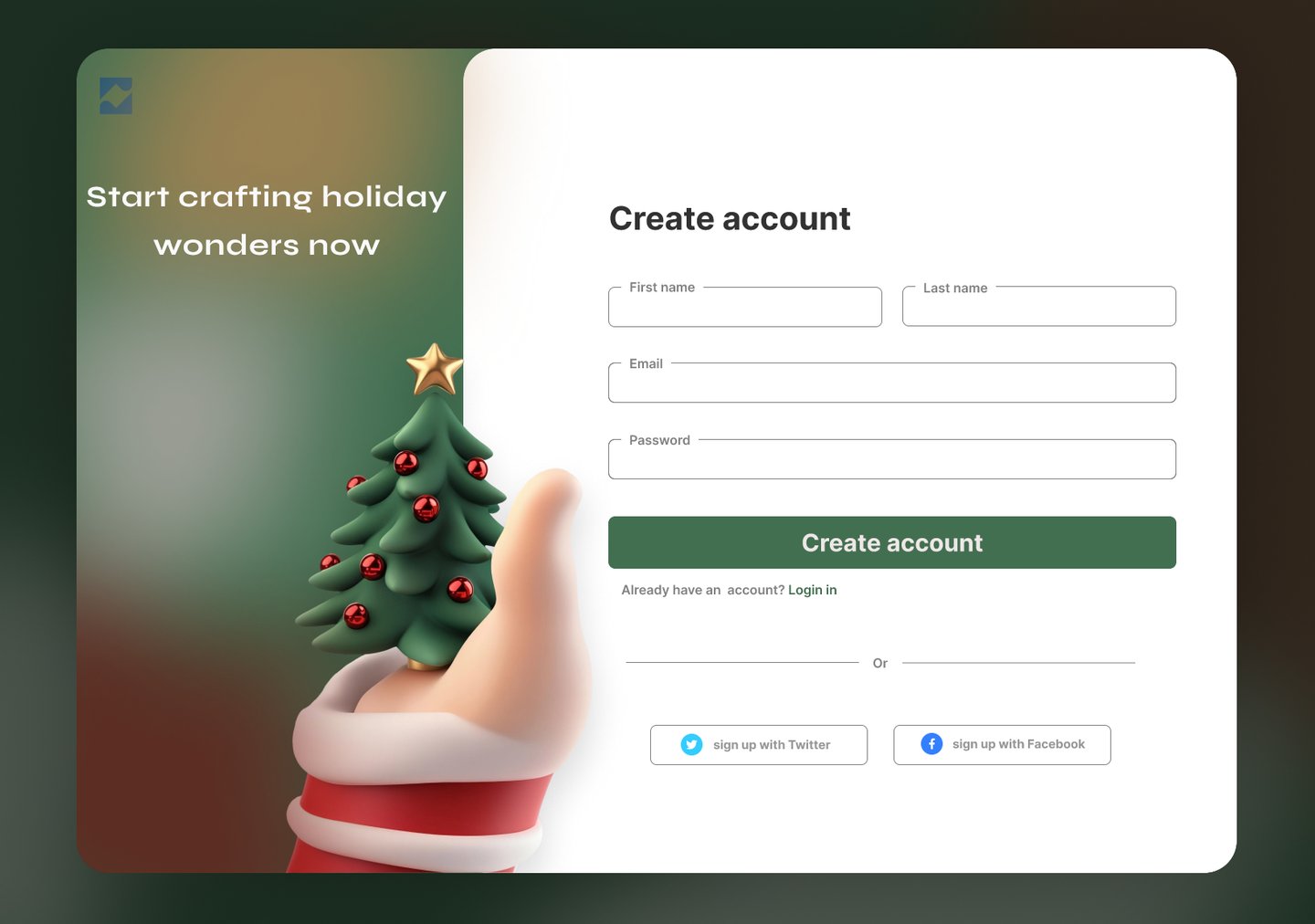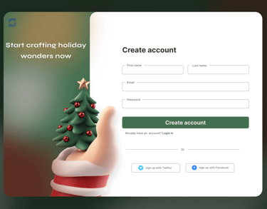 It enables crafters of all levels to sign up or log in seamlessly via email, Twitter, or Facebook, sparking holiday wonders. Targeting broad audiences, this page sets a dreamy, festive tone, making account creation feel like the start of crafting magic.